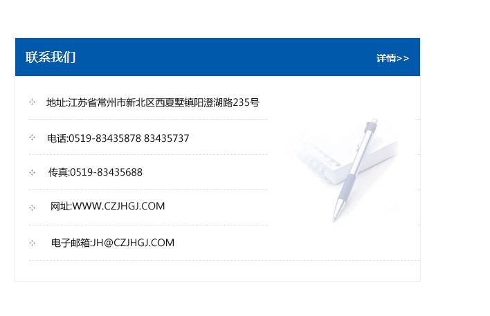 地址:常州市新北區友邦商務大廈1幢16、17層  電話:0519-85101652  傳真:0519-85112595  郵編:213022  網址:www.cz-jiayue_cn.hncwsl.com  郵箱:xiajifengaa@163.com